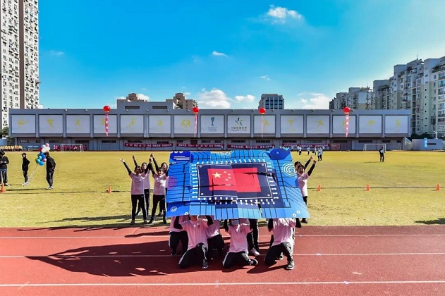 此時綠茵場上,方陣隊伍列隊完畢,操場上擺出巨型芯片造型,動作整齊劃一,場面生動震撼。
