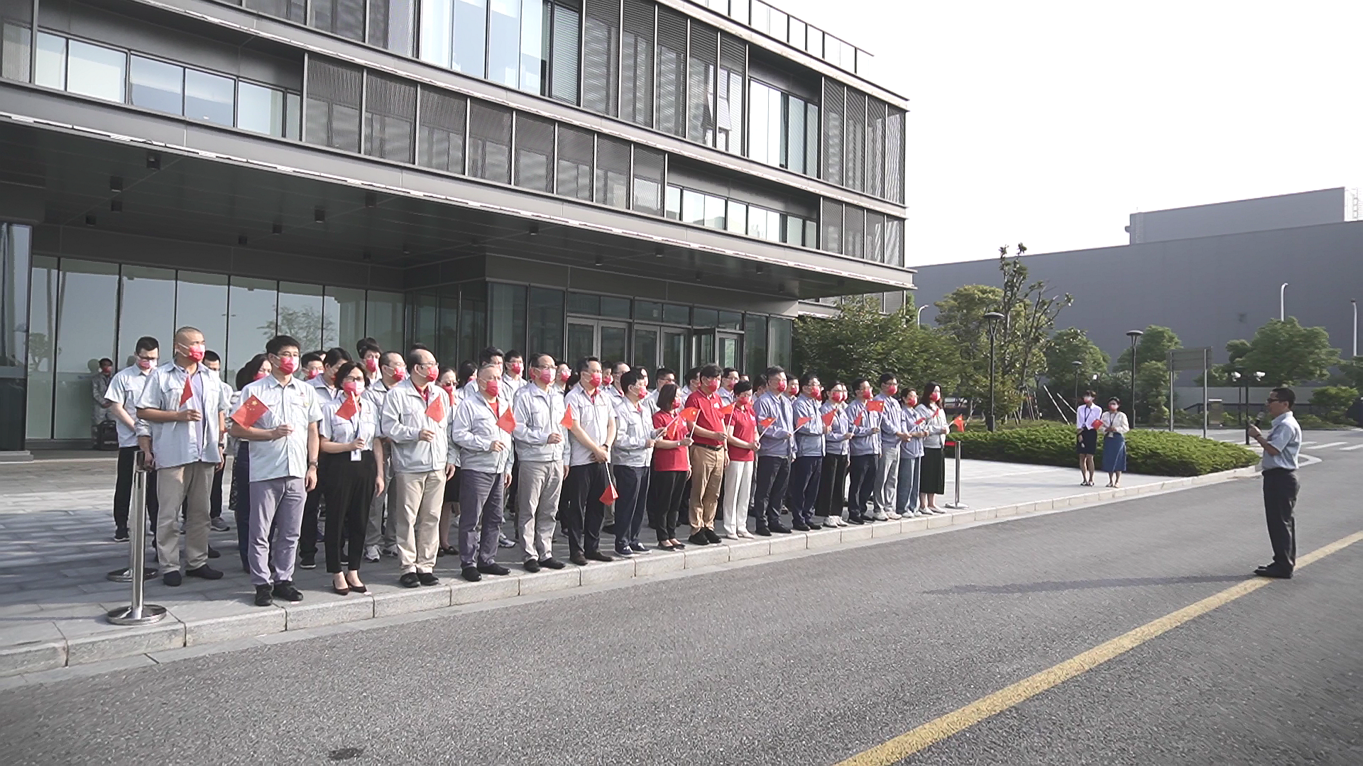 早上8:00,升國(guó)旗儀式正式開始,全體人員同唱《中華人民共和國(guó)國(guó)歌》,向國(guó)旗行注目禮,莊嚴(yán)肅穆的國(guó)歌聲回蕩在華虹六廠,鮮艷的五星紅旗在嘹亮的國(guó)歌聲中冉冉升起,愛國(guó)之情在心中激蕩。